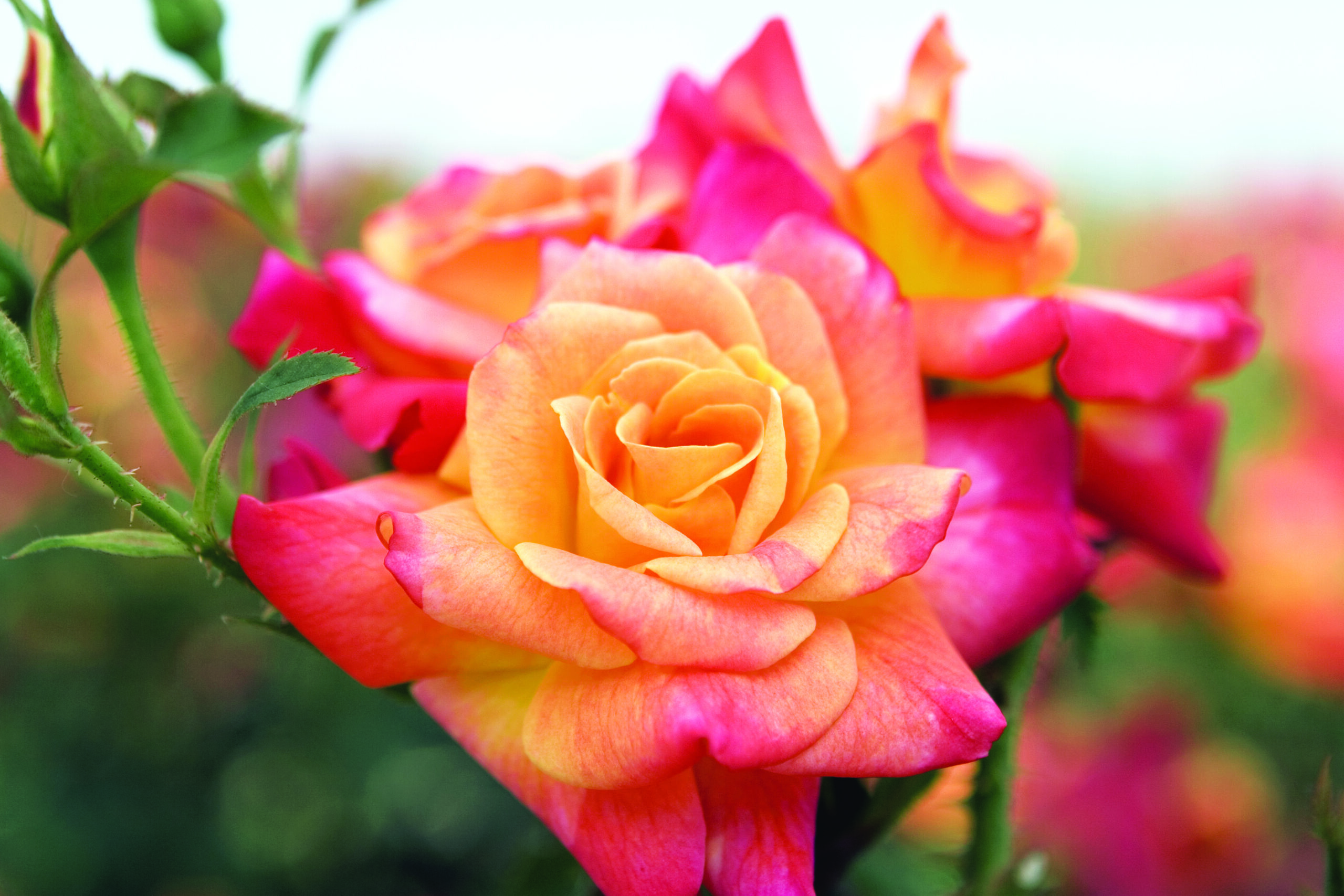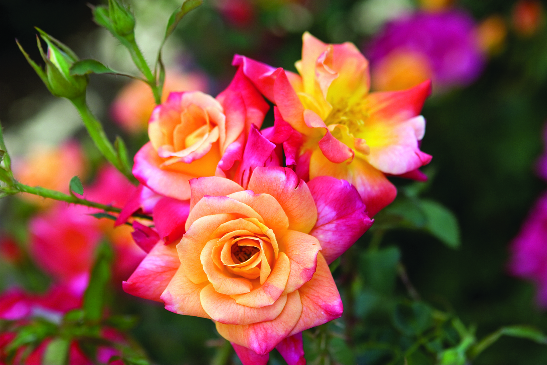 A continuous kaleidoscope of ever-changing yellow to scarlet back to orange and carmine has made this rose a classic in mild climates. The green apple foliage helps soften the bold in-your-face statement made by the profusion of vivid, almost indescribable blooms.